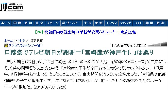 口蹄疫でテレビ朝日が謝罪=「宮崎産が神戸牛に」は誤り(時事ドットコム)