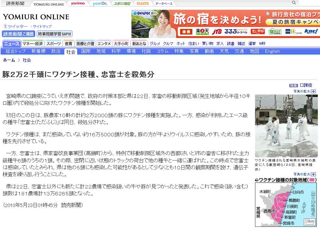 宮崎県の口蹄疫(こうていえき)問題で、政府の対策本部と県は22日、家畜の移動制限区域(発生地域から半径10キロ圏)内で殺処分に向けたワクチン接種を開始した。