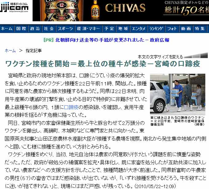 宮崎県と政府の現地対策本部は、口蹄(こうてい)疫の爆発的拡大を食い止めるためのワクチン接種を22日午前11時、開始した。接種に同意を得た農家から順次接種するもようだ。同県は22日未明、肉用牛産業の壊滅的打撃を食い止める目的で特例的に非難させていた最上級種牛6頭の内、1頭に口蹄疫の感染疑いを確認し、食用牛産業の根幹を揺るがす危機に陥っていた。