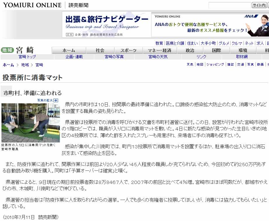 感染が集中した川南町では、町内13投票所で消毒用マットを設置するほか、駐車場の出入り口に消石灰をまいて感染防止を図る。