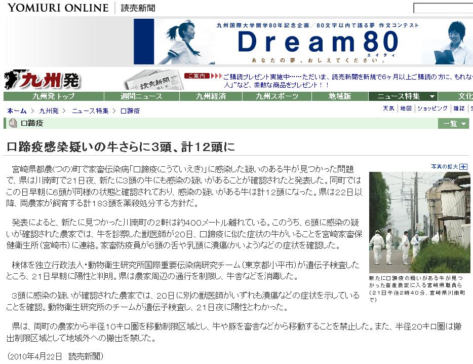 宮崎県都農(つの)町で家畜伝染病「口蹄疫(こうていえき)」に感染した疑いのある牛が見つかった問題で、県は川南町で21日夜、新たに3頭の牛にも感染の疑いがあることが確認されたと発表した。同町ではこの日早朝に6頭が同様の状態と確認されており、感染の疑いがある牛は計12頭になった。県は22日以降、両農家が飼育する計183頭を薬殺処分する方針だ。