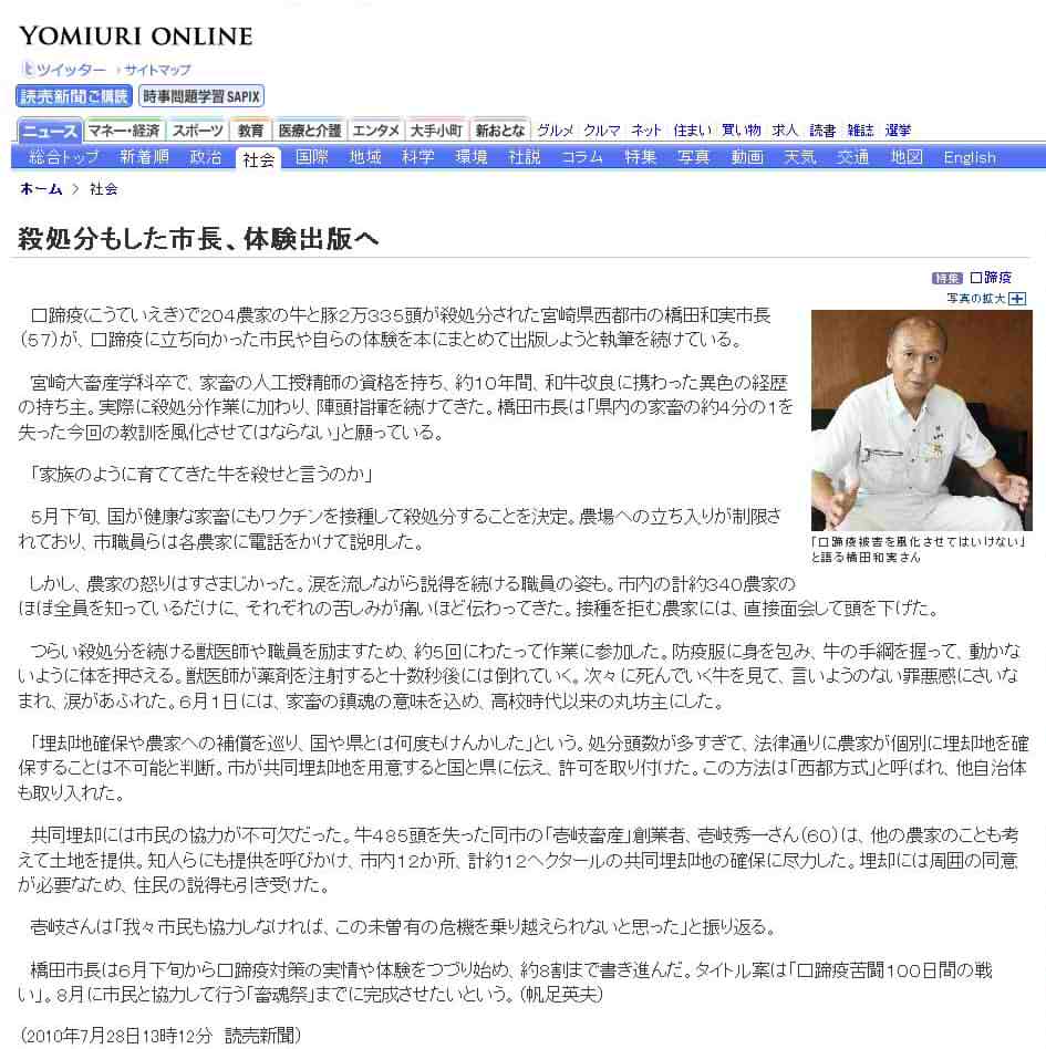 橋田市長は6月下旬から口蹄疫対策の実情や体験をつづり始め、約8割まで書き進んだ。タイトル案は「口蹄疫苦闘100日間の戦い」。8月に市民と協力して行う「畜魂祭」までに完成させたいという。(帆足英夫)