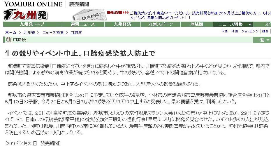 イベントでは、25日の「高崎町海の幸祭り」(都城市)と「えびの京町温泉マラソン大会」(えびの市)が中止になったほか、29日に予定されていた、日南市の伝統芸能「泰平踊」の定期公演と三股町の恒例行事「早馬まつり」は開催を見合わせた。いずれも多くの人出が見込まれていた。同町は都農、川南両町から南に遠く離れているが、農業生産額の約7割を畜産が占めていることから、町観光協会は「感染を防止するため苦渋の判断」としている。