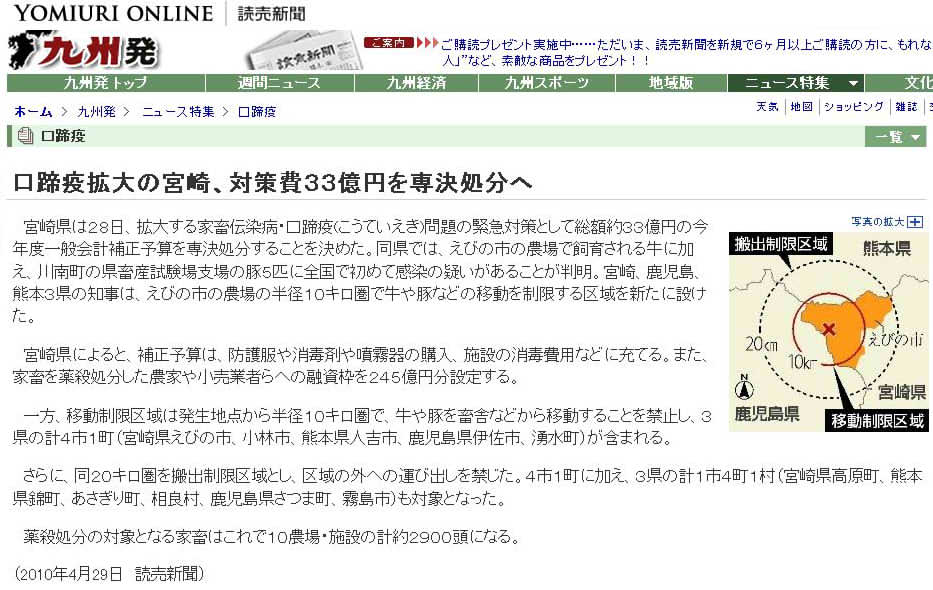 宮崎県は28日、拡大する家畜伝染病・口蹄疫(こうていえき)問題の緊急対策として総額約33億円の今年度一般会計補正予算を専決処分することを決めた。同県では、えびの市の農場で飼育される牛に加え、川南町の県畜産試験場支場の豚5匹に全国で初めて感染の疑いがあることが判明。宮崎、鹿児島、熊本3県の知事は、えびの市の農場の半径10キロ圏で牛や豚などの移動を制限する区域を新たに設けた。