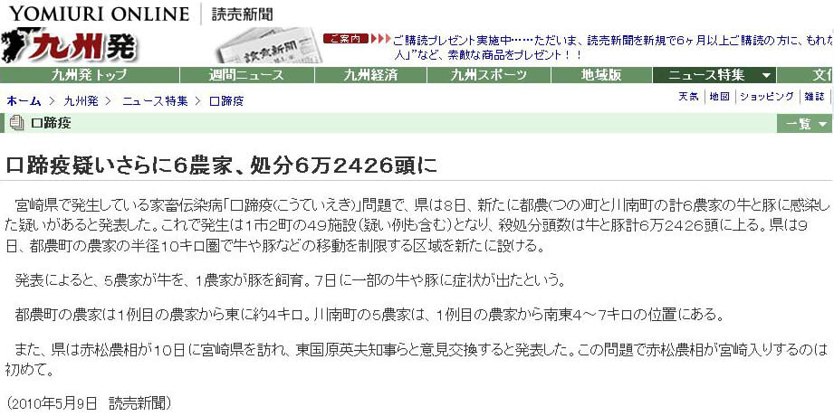 また、県は赤松農相が10日に宮崎県を訪れ、東国原英夫知事らと意見交換すると発表した。この問題で赤松農相が宮崎入りするのは初めて。