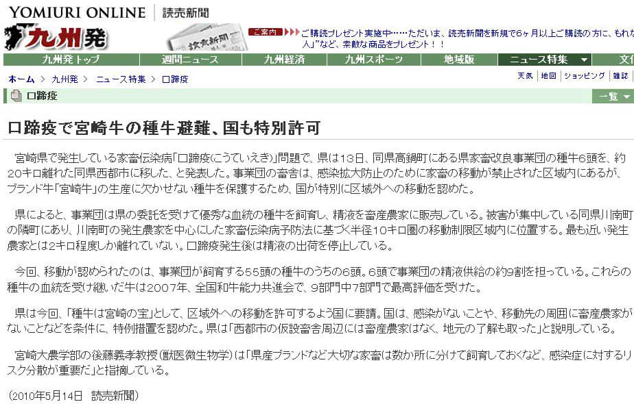 宮崎県で発生している家畜伝染病「口蹄疫(こうていえき)」問題で、県は13日、同県高鍋町にある県家畜改良事業団の種牛6頭を、約20キロ離れた同県西都市に移した、と発表した。事業団の畜舎は、感染拡大防止のために家畜の移動が禁止された区域内にあるが、ブランド牛「宮崎牛」の生産に欠かせない種牛を保護するため、国が特別に区域外への移動を認めた。