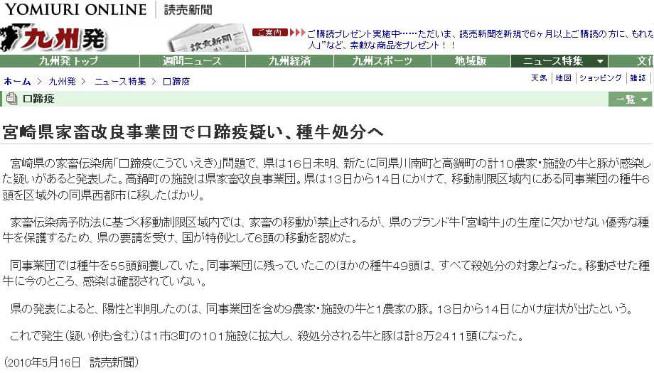 宮崎県の家畜伝染病「口蹄疫(こうていえき)」問題で、県は16日未明、新たに同県川南町と高鍋町の計10農家・施設の牛と豚が感染した疑いがあると発表した。高鍋町の施設は県家畜改良事業団。県は13日から14日にかけて、移動制限区域内にある同事業団の種牛6頭を区域外の同県西都市に移したばかり。