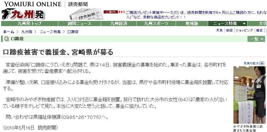 家畜伝染病「口蹄疫(こうていえき)」問題で、県は14日、被害義援金の募集を始めた。集まった募金は、各市町村を通じて、被害を受けた畜産農家へ配分される。