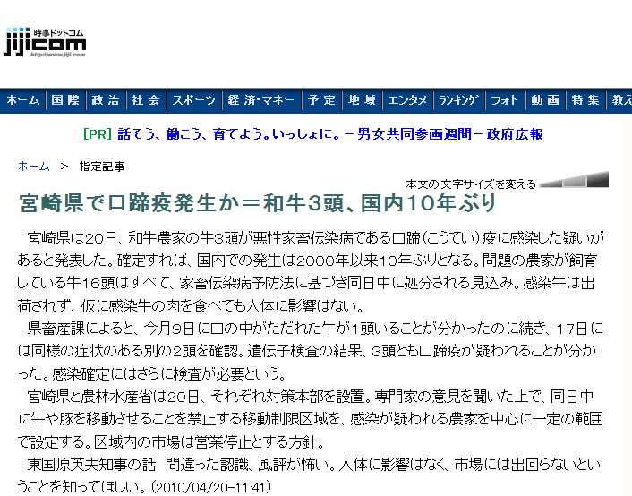 宮崎県は20日、和牛農家の牛3頭が悪性家畜伝染病である口蹄(こうてい)疫に感染した疑いがあると発表した。確定すれば、国内での発生は2000年以来10年ぶりとなる。問題の農家が飼育している牛16頭はすべて、家畜伝染病予防法に基づき同日中に処分される見込み。感染牛は出荷されず、仮に感染牛の肉を食べても人体に影響はない。