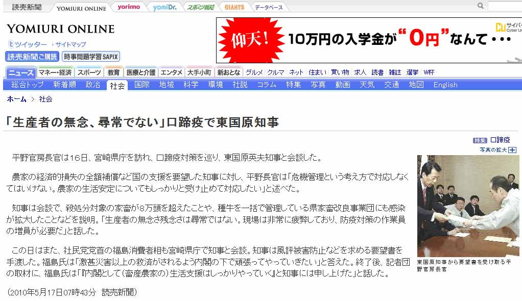 鳩山首相は17日昼、赤松農相と首相官邸で会談し、宮崎県で感染が拡大している口蹄疫(こうていえき)被害への対応として、2010年度予算の予備費から1000億円を充てるよう指示した。