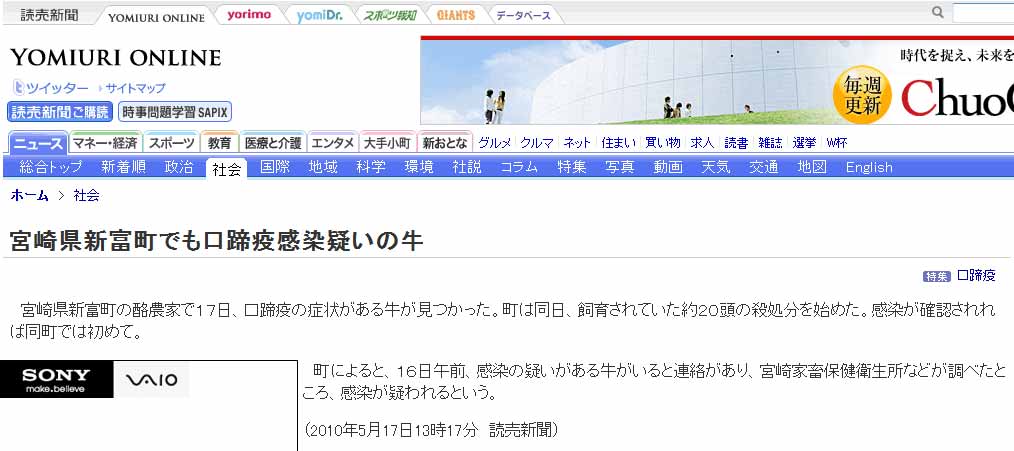 「宮崎県新富町でも口蹄疫感染疑いの牛(読売新聞社)」をウィキ内検索
