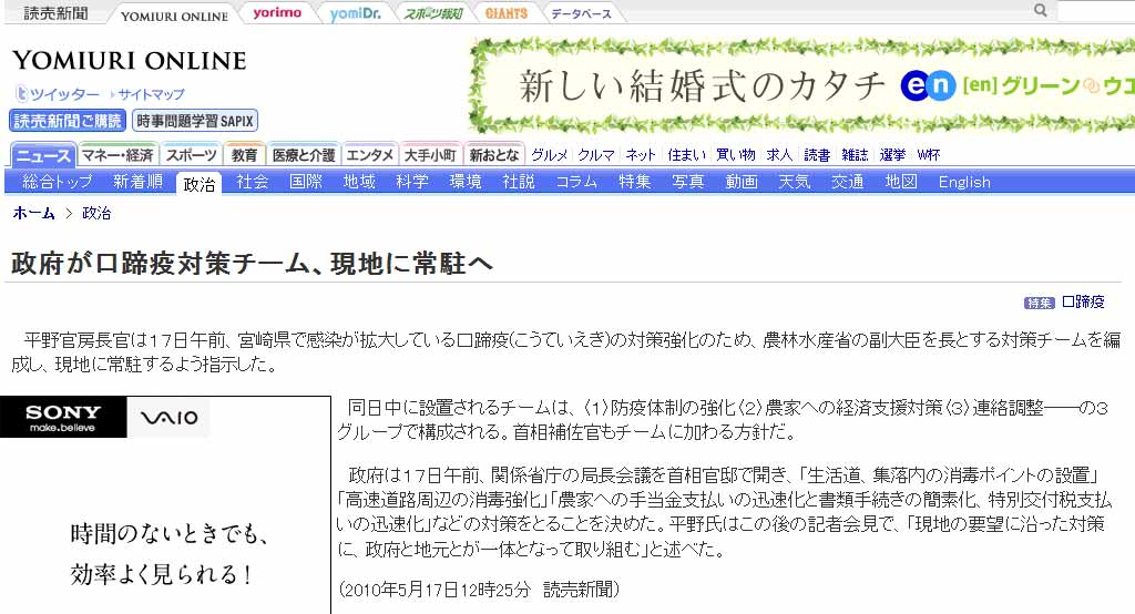 平野官房長官は17日午前、宮崎県で感染が拡大している口蹄疫(こうていえき)の対策強化のため、農林水産省の副大臣を長とする対策チームを編成し、現地に常駐するよう指示した。