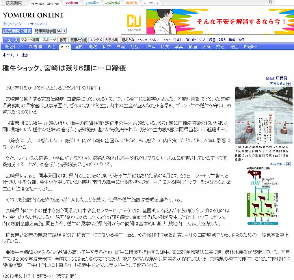 同事業団には種牛55頭のほか、種牛の肉質検査・評価用の牛259頭がいる。うち5頭に口蹄疫感染の疑いがあり、同じ農場にいた種牛49頭も家畜伝染病予防法に基づき殺処分される。残りの主力級6頭は同県西都市に避難ずみ。