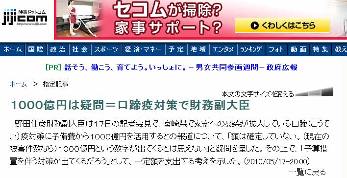 「1000億円は疑問=口蹄疫対策で財務副大臣(時事通信社)」をウィキ内検索