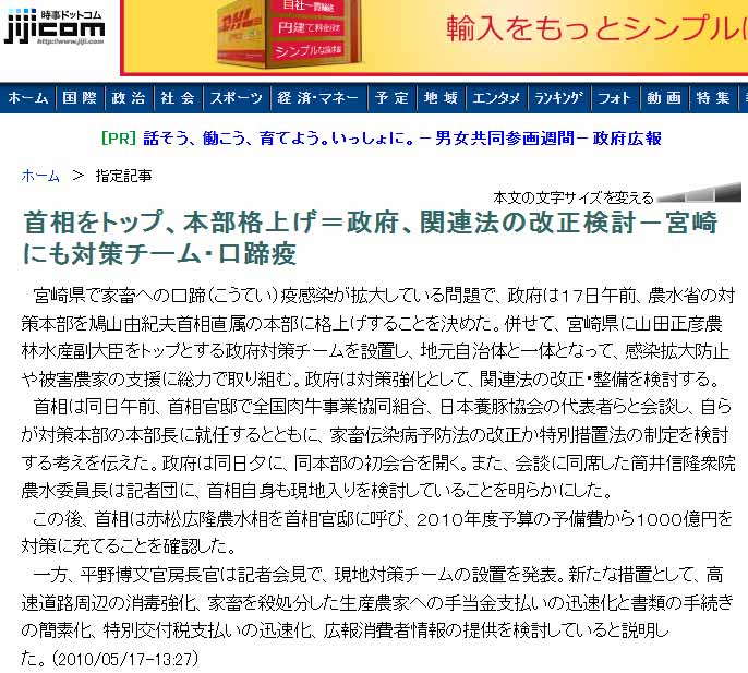 この後、首相は赤松広隆農水相を首相官邸に呼び、2010年度予算の予備費から1000億円を対策に充てることを確認した。
