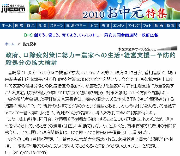 会合では鳩山首相が冒頭、「口蹄疫の拡大が大変懸念される。危機管理上重大な課題だ」と指摘。「一刻も早く農家のみなさんに安心してもらえる状況をつくらないといけない」と強調した。