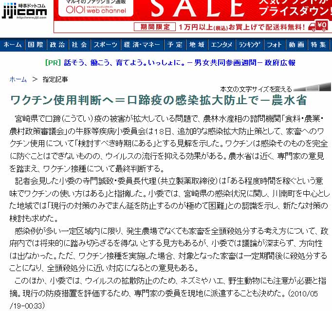 宮崎県で口蹄(こうてい)疫の被害が拡大している問題で、農林水産相の諮問機関「食料・農業・農村政策審議会」の牛豚等疾病小委員会は18日、追加的な感染拡大防止策として、家畜へのワクチン使用について「検討すべき時期にある」とする見解を示した。ワクチンは感染そのものを完全に防ぐことはできないものの、ウイルスの流行を抑える効果がある。農水省は近く、専門家の意見を踏まえ、ワクチン接種について最終判断する。