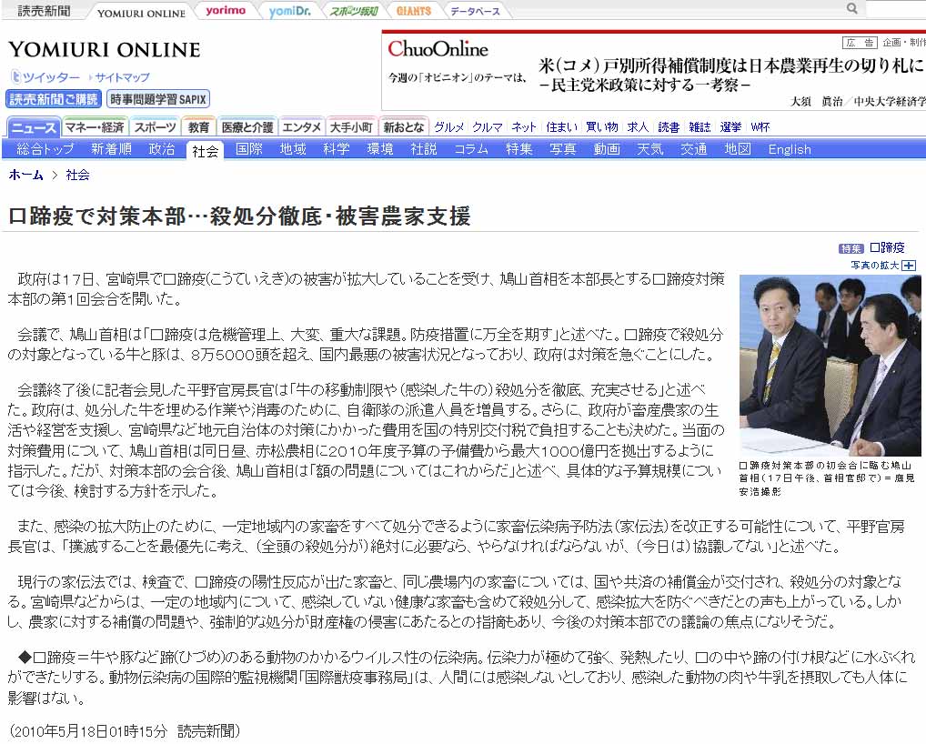 会議で、鳩山首相は「口蹄疫は危機管理上、大変、重大な課題。防疫措置に万全を期す」と述べた。口蹄疫で殺処分の対象となっている牛と豚は、8万5000頭を超え、国内最悪の被害状況となっており、政府は対策を急ぐことにした。
