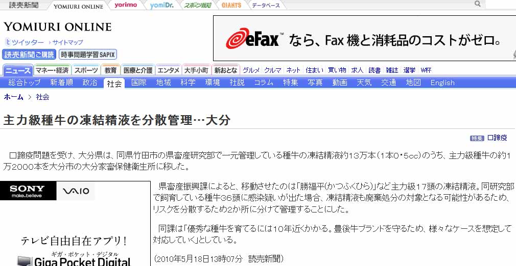 口蹄疫問題を受け、大分県は、同県竹田市の県畜産研究部で一元管理している種牛の凍結精液約13万本(1本0・5cc)のうち、主力級種牛の約1万2000本を大分市の大分家畜保健衛生所に移した。
