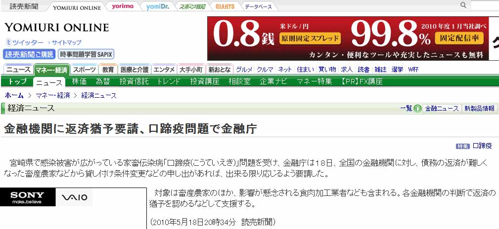 金融機関に返済猶予要請、口蹄疫問題で金融庁(読売新聞社).jpg