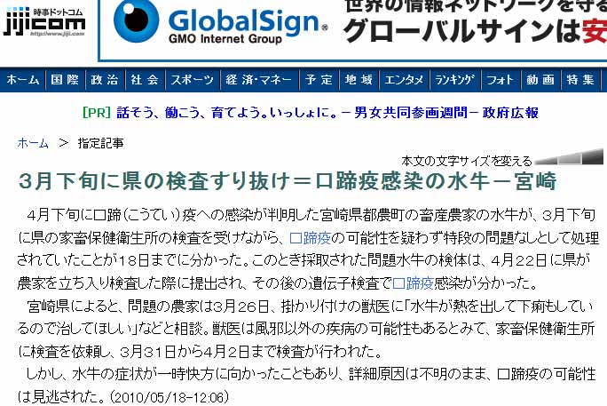 4月下旬に口蹄(こうてい)疫への感染が判明した宮崎県都農町の畜産農家の水牛が、3月下旬に県の家畜保健衛生所の検査を受けながら、口蹄疫の可能性を疑わず特段の問題なしとして処理されていたことが18日までに分かった。このとき採取された問題水牛の検体は、4月22日に県が農家を立ち入り検査した際に提出され、その後の遺伝子検査で口蹄疫感染が分かった。