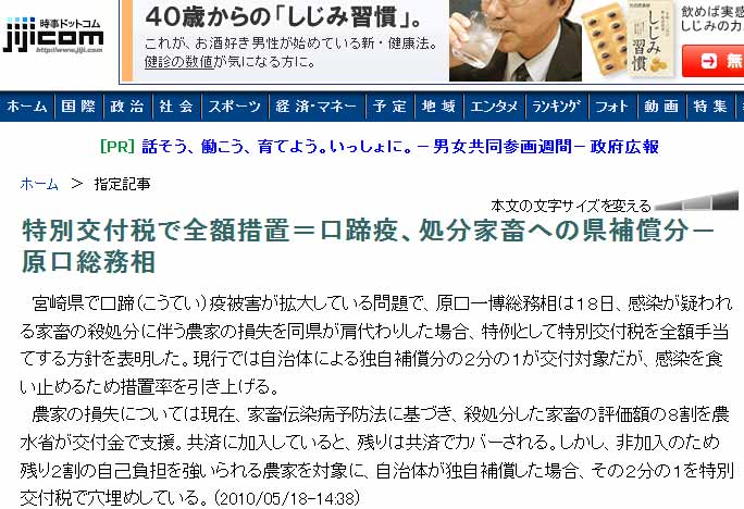 宮崎県で口蹄(こうてい)疫被害が拡大している問題で、原口一博総務相は18日、感染が疑われる家畜の殺処分に伴う農家の損失を同県が肩代わりした場合、特例として特別交付税を全額手当てする方針を表明した。現行では自治体による独自補償分の2分の1が交付対象だが、感染を食い止めるため措置率を引き上げる。