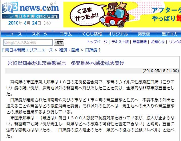 宮崎県の東国原英夫知事は18日の定例記者会見で、家畜のウイルス性感染症口蹄(こうてい)疫の疑い例が、多発地以外の新富町へ飛び火したことを受け、全県的な非常事態宣言をした。