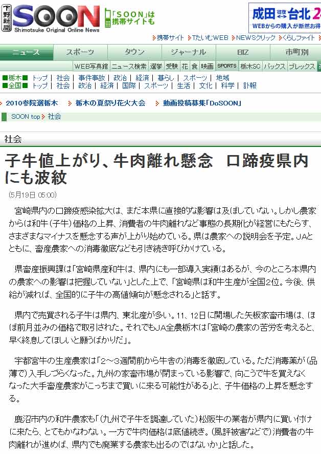 鹿沼市内の和牛農家も「(九州で子牛を調達していた)松阪牛の業者が県内に買い付けに来たら、とてもかなわない。一方で牛肉価格は底値続き。(風評被害などで)消費者の牛肉離れが進めば、県内でも廃業する農家も出るのではないか」と話した。