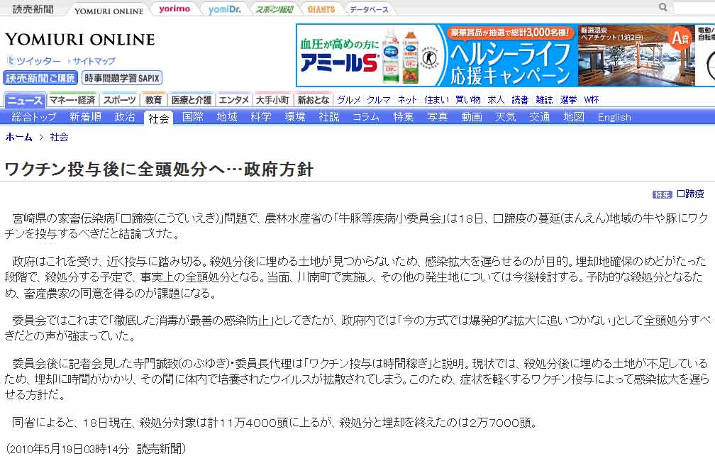 委員会ではこれまで「徹底した消毒が最善の感染防止」としてきたが、政府内では「今の方式では爆発的な拡大に追いつかない」として全頭処分すべきだとの声が強まっていた。