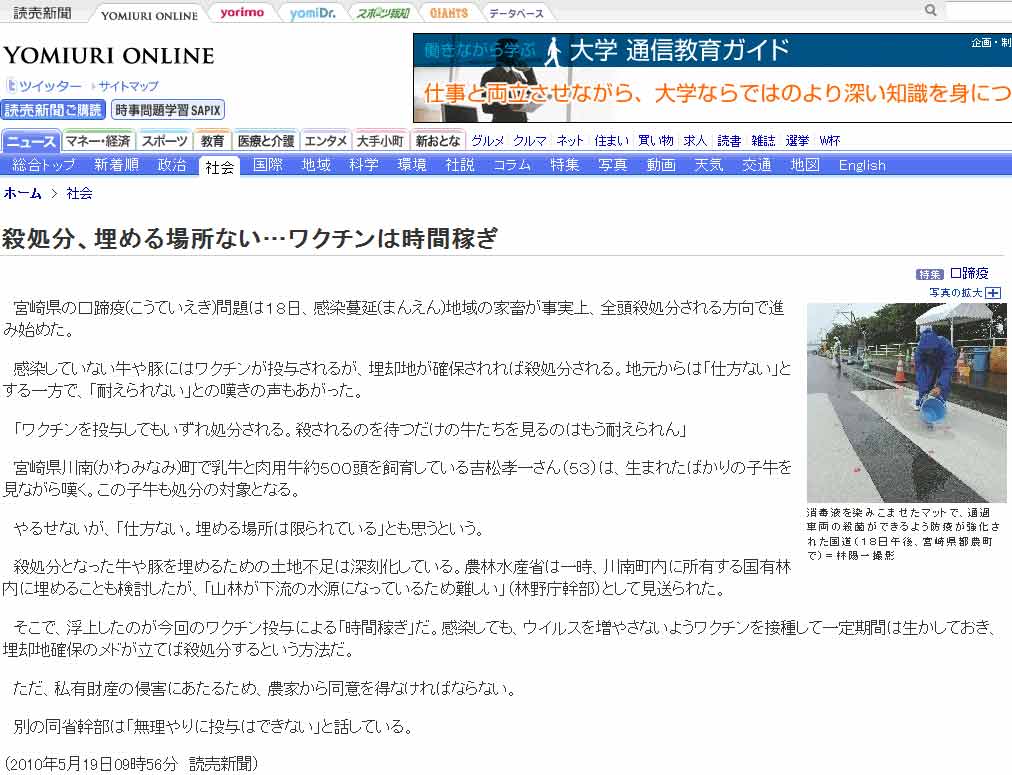 そこで、浮上したのが今回のワクチン投与による「時間稼ぎ」だ。感染しても、ウイルスを増やさないようワクチンを接種して一定期間は生かしておき、埋却地確保のメドが立てば殺処分するという方法だ。