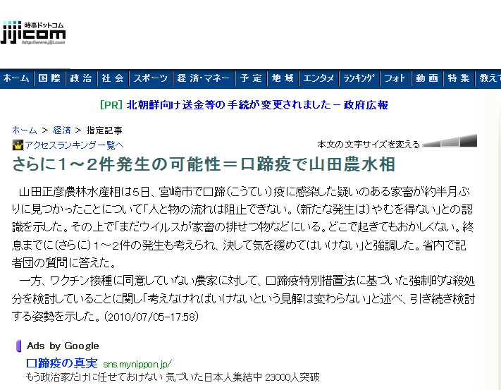 山田正彦農林水産相は5日、宮崎市で口蹄(こうてい)疫に感染した疑いのある家畜が約半月ぶりに見つかったことについて「人と物の流れは阻止できない。(新たな発生は)やむを得ない」との認識を示した。その上で「まだウイルスが家畜の排せつ物などにいる。どこで起きてもおかしくない。終息までに(さらに)1~2件の発生も考えられ、決して気を緩めてはいけない」と強調した。省内で記者団の質問に答えた。