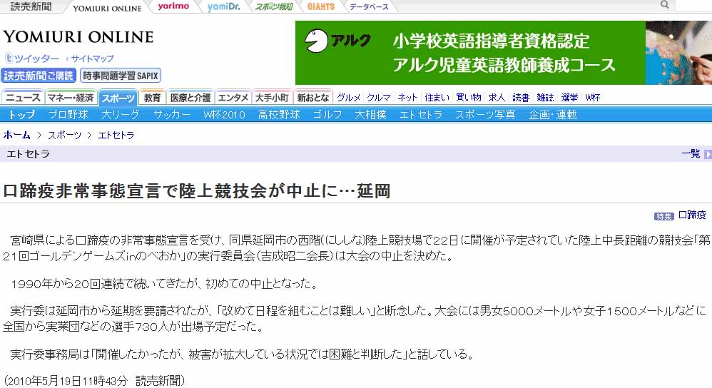 宮崎県による口蹄疫の非常事態宣言を受け、同県延岡市の西階(にししな)陸上競技場で22日に開催が予定されていた陸上中長距離の競技会「第21回ゴールデンゲームズinのべおか」の実行委員会(吉成昭二会長)は大会の中止を決めた。