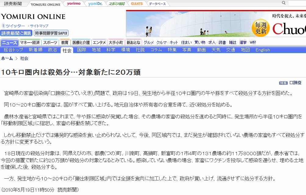 宮崎県の家畜伝染病「口蹄疫(こうていえき)」問題で、政府は19日、発生地から半径10キロ圏内の牛や豚をすべて殺処分する方針を固めた。