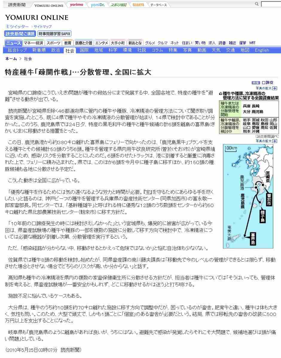 読売新聞が宮崎県を除く46都道府県に管内の種牛や種豚、冷凍精液の管理方法について聞き取り調査を実施したところ、既に4県で種牛やその冷凍精液の分散管理が始まり、14県で検討中であることが分かった。このうち、鹿児島県では24日夕、特産の黒毛和牛の種牛と種牛候補の計6頭を離島の喜界島(きかいじま)に移動させる措置をとった。