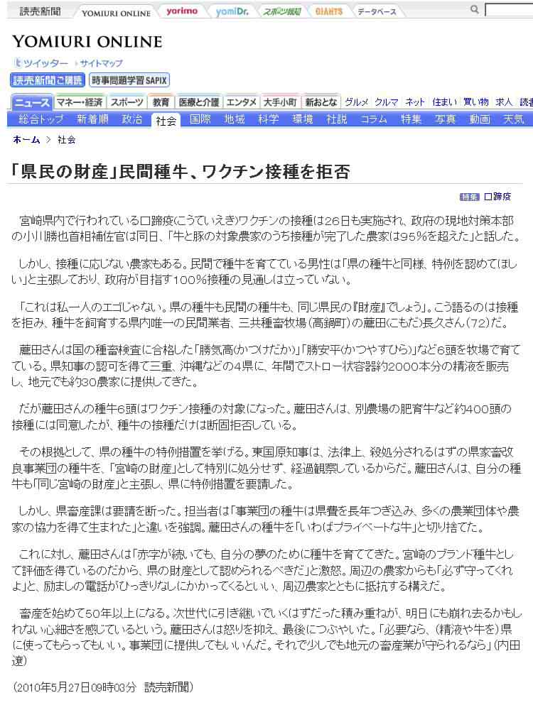 「これは私一人のエゴじゃない。県の種牛も民間の種牛も、同じ県民の『財産』でしょう」。こう語るのは接種を拒み、種牛を飼育する県内唯一の民間業者、三共種畜牧場(高鍋町)の薦田長久さん(72)だ。