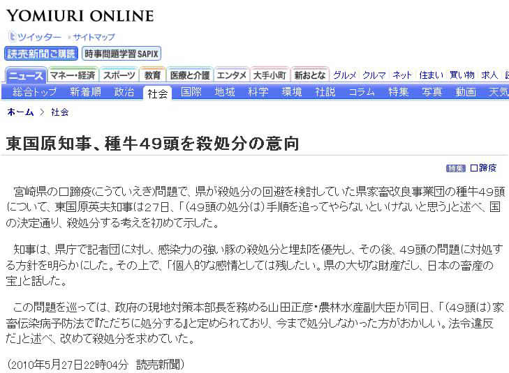 宮崎県の口蹄疫問題で、県が殺処分の回避を検討していた県家畜改良事業団の種牛49頭について、東国原英夫知事は27日、「(49頭の処分は)手順を追ってやらないといけないと思う」と述べ、国の決定通り、殺処分する考えを初めて示した。