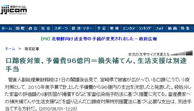 「口蹄疫対策、予備費96億円=損失補てん、生活支援は別途手当(時事ドットコム)」をウィキ内検索
