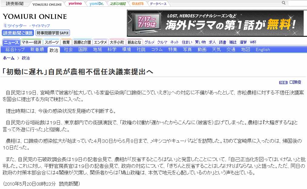 自民党は19日、宮崎県で被害が拡大している家畜伝染病「口蹄疫(こうていえき)」への対応に不備があったとして、赤松農相に対する不信任決議案を国会に提出する方向で検討に入った。