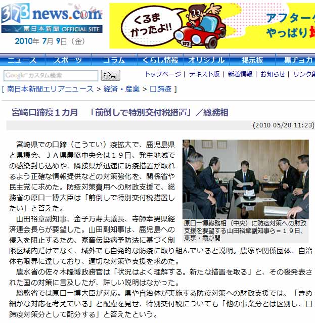 総務省では原口一博大臣が対応。県や自治体が実施する防疫対策への財政支援では、「きめ細かな対応を考えている」と配慮を見せ、特別交付税についても「他の事業分とは区別し、口蹄疫対策分として配分する」と答えたという。