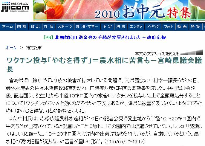 宮崎県で口蹄(こうてい)疫の被害が拡大している問題で、同県議会の中村幸一議長らが20日、農林水産省の佐々木隆博政務官を訪れ、口蹄疫対策に関する要望書を渡した。中村氏は会談後、記者団に、発生地から半径10キロ圏内の家畜にワクチンを投与した上で全頭殺処分することについて「ワクチンがちゃんと効くのだろうかと不安はあるが、隣県に被害を及ぼさないようにするためにはやむを得ない」との認識を示した。