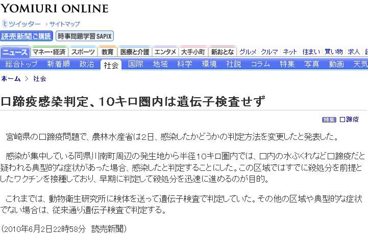 感染が集中している同県川南町周辺の発生地から半径10キロ圏内では、口内の水ぶくれなど口蹄疫だと疑われる典型的な症状があった場合、感染したと判定することにした。この区域ではすでに殺処分を前提としたワクチンを接種しており、早期に判定して殺処分を迅速に進めるのが目的。