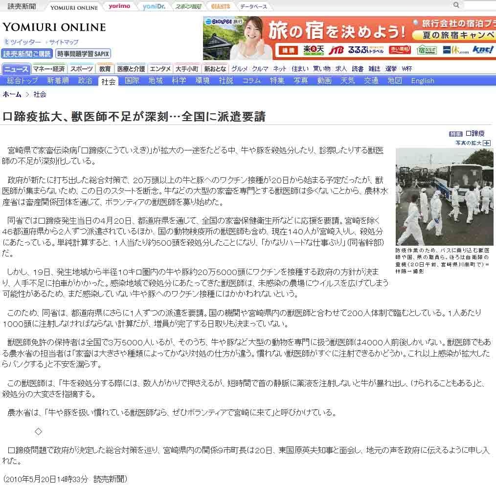 同省では口蹄疫発生当日の4月20日、都道府県を通じて、全国の家畜保健衛生所などに応援を要請。宮崎を除く46都道府県から2人ずつ派遣されているほか、国の動物検疫所の獣医師も含め、現在140人が宮崎入りし、殺処分にあたっている。単純計算すると、1人当たり約500頭を殺処分したことになり、「かなりハードな仕事ぶり」(同省幹部)だ。