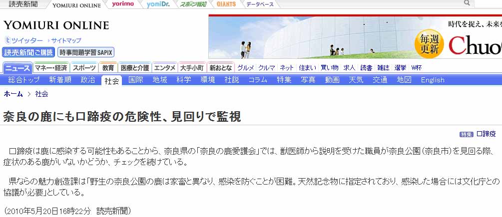 「奈良の鹿にも口蹄疫の危険性、見回りで監視(読売新聞社)」をウィキ内検索