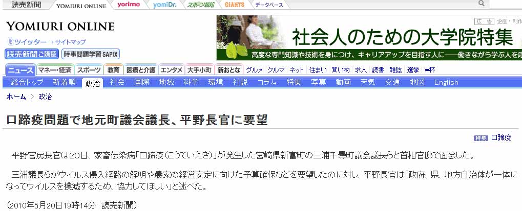 「口蹄疫問題で地元町議会議長、平野長官に要望(読売新聞社)」をウィキ内検索