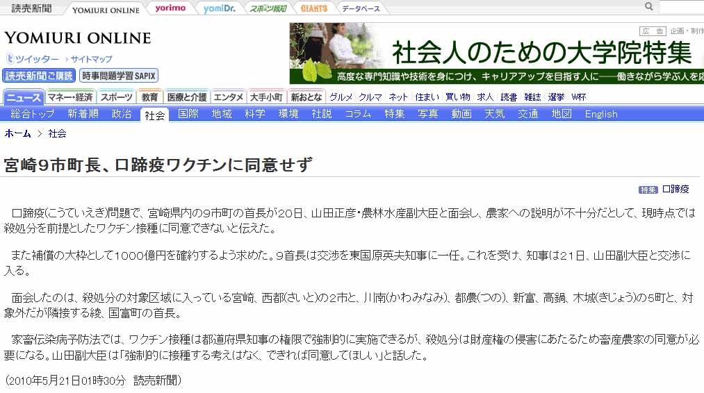口蹄疫(こうていえき)問題で、宮崎県内の9市町の首長が20日、山田正彦・農林水産副大臣と面会し、農家への説明が不十分だとして、現時点では殺処分を前提としたワクチン接種に同意できないと伝えた。