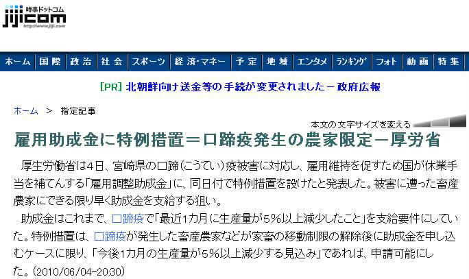 厚生労働省は4日、宮崎県の口蹄(こうてい)疫被害に対応し、雇用維持を促すため国が休業手当を補てんする「雇用調整助成金」に、同日付で特例措置を設けたと発表した。被害に遭った畜産農家にできる限り早く助成金を支給する狙い。