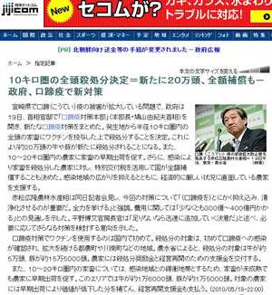 10キロ圏の全頭殺処分決定=新たに20万頭、全額補償も−政府、口蹄疫で新対策(時事通信社).jpg | 2010/07/06 (火) 04:52:02 |