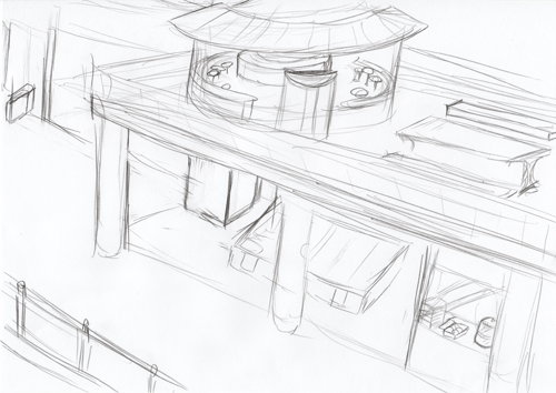 これは帝国環状線側のテナントのつもり。上はカフェ、下は物品販売所ー、のつもり。
