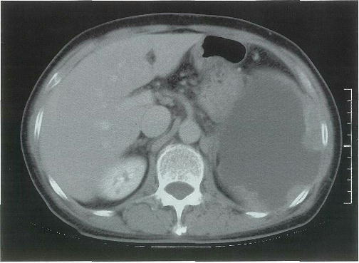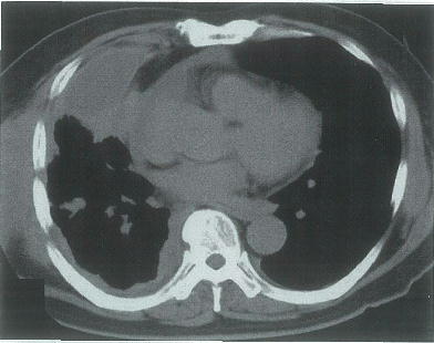 71歳の男性。呼吸困難を主訴に来院した。20歳から40年間,ビル建設の仕事に従事した。喫煙 20本/日を30年間。胸水中のヒアルロン酸は92300ng/mlと著明な増加を示す。胸部エックス線写真と胸腹部造影CTとを別に示す。