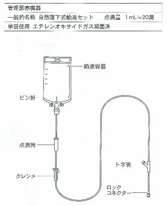 72歳の女性。咳を主訴に来院した。3日前から咳が出るようになり,食欲も徐々に減退した。昨日はお茶を湯飲みに3倍飲んだが,食事はとれなかった。今朝からは寒気がして,体が震えるという。意識は清明。体温 38.2℃。脈拍 96/分,整。血圧 138/80mmHg。皮膚はやや乾燥している。coarse cracklesを聴取する。指導医と相談し,入院させて維持液1500mlを9時間かけて輸液することとした。輸液セットを輸液容器に接続した。輸液セットの包装紙の記載と輸液セットの模式図とを別に示す。